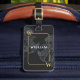 Reser i förstaklassstil med denna anpassningsbara resväskemärke som har ett klassiskt svart och grått paisley-mönster med en elegant guldemalj och anpassningsbart namn och initialer på framsidan. Baksidan har utrymme för att lägga till namn, adress, telefonnummer och e-postadress. Ändra texten på fram- och baksidan för att skapa en elegant present för män som gillar att resa i stil.