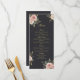 En lyxig menykort för bröllop med en djup svart bakgrund prydd med ömtåliga rosor i blush och förfinade guldfärgade accenter. Den graciösa blomsterarrangemangen och den eleganta typografin skapar en tidlös och sofistikerad dukning på receptionsbordet.