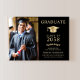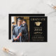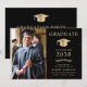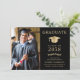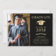 Elegant svart och guld inbjudan till universitetsavgångsfest med en studentmössa, avgångseleven foto, deras namn i klassisk serif-typografi och deras skola, huvudämne, utmärkelser, etc. Anpassa dina festdetaljer på baksidan.
