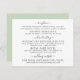 Bröllopsinformation inklusionskort innehåller reception, boende på två hotell och information om bröllopswebbplats. Den mjuka svarta ordvalet kan anpassas helt för ditt speciella evenemang. Observera också att den mjuka gröna bakgrundsfärgen på baksidan av kortet kan ändras till vit eller en annan färg via Anpassa.