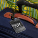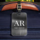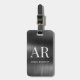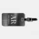 Stilren modern elegant 2 monogram initial namn svart metall anpassad personlig personlig bagagetagg. Denna design har fullständigt namn typografi med 2 monogram initialer, adressinfo på svart falsk metallisk folie bakgrund. Dessa är lätta att anpassa. Stilrent feminint eller maskulint present för bröllop, söt 16 födelsedag, bröllopsdusch, examen, och för alla som älskar elegant stil.