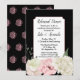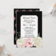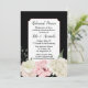 Elegant bröllopsinbjudan i svart med ett textfält i vitt och rosa detaljer. Vackra grafik med vita och rosa blommor pryder nedre delen av inbjudan. Anpassa den svarta texten för din bröllpsfest.