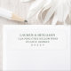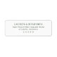 Denna returadressetikett har en ren, minimalistisk design med centrerad text på vit bakgrund. Det klassiska serif-teckensnittet ger en elegant touch, medan den svart-vita färgpaletten skapar ett tidlöst utseende. Perfekt för formella tillfällen, erbjuder denna etikett anpassningsbara fält för namn och adresser, vilket säkerställer ett personligt men ändå sofistikerat utseende. Dess enkla komposition betonar klarhet och förfining, vilket gör den ideal för bröllop eller andra speciella evenemang.