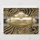 Zebra födelsedagsinbjudan med vackra svarta och gyllene diamanter på en zebra bakgrund.