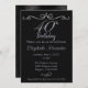 En elegant 40-års inbjudan, denna design har en svart bakgrund med silverdekorationer. "40" är skrivet i en glitterliknande teckensnitt (inte verklig glitter). Lätt att fylla i mallar gör anpassning enkel. Beställ din idag!