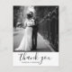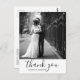 Eleganta svart & vit tack-kort att skicka till era bröllopsgäster. Lägg till ert eget vackra bröllopsfoto och namn. Under fotot står "tack" i modern scriptfont. På baksidan finns ett standardmeddelande som du kan redigera. Din returadress kan också läggas till enkelt.