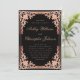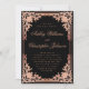 Denna eleganta svarta och rosa (bröllopsinbjudan med en vintagekänsla har en utsirad rosa ram med eleganta barocka (falska) rosenguldsdekorationer i hörnen, på en svart bakgrund. Brudens och brudgummens namn är skrivna med ett elegant kalligrafiskt typsnitt. All text kan anpassas och har en rosa färg liknande ramen.