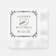 En dekorativ svart rullram med utsmyckade hörndekorationer visar parets monogramnamn och datum i en förfinad blandning av serif och kalligrafi-skrift på dessa eleganta bröllopsservetter. Den tidlösa svart-vita designen gör en mångsidig accent för alla bröllopsreceptioner, cocktailtimme eller repetitionmiddag.