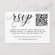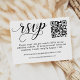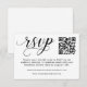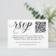 Modern svart-vit bröllopssvarskortdesign med RSVP i elegant script med din anpassade QR-kod, bröllopswebbplats och valfri e-postadress så att gästerna kan svara online istället för att skicka tillbaka ett kort. Svart text och vit bakgrundsfärg kan uppdateras för att samordna med ditt brölloppsfärgschema.