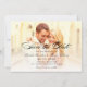 Dessa eleganta bröllops klara besked kortsatser har en klassisk svart textöverlägg med förlovningsfoto bakgrund. Ett guld färgat schweiziskt prickmönster visas på det vita baksidan av kortet.