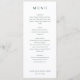 Denna eleganta meny design har en ren, vertikal layout med fokus på enkelhet och sofistikering. Den svarta texten är placerad mot en vit bakgrund, vilket skapar ett högkontrast, lättläst utseende. Serifferade teckensnitt används genomgående, vilket ger en klassisk touch åt den övergripande stilen. Perfekt för formella evenemang som bröllop eller exklusiva sammankomster, betonar denna design tydlighet och förfining, vilket gör den idealisk för att presentera ett välvalt urval av rätter.