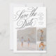 Denna eleganta save the date-kort med tre fotografier för bröllop har en vacker "save the date"-skripttypsbehandling, enkel anpassad text och en kollage av ett stort och två mindre foton. Denna vackra save the date-design är ett bra sätt att dela bilder från förlovningen och berätta detaljer om brölloppet för familj och vänner. Baksidan har en elegant matchande svart design med mjuka prickar tillsammans med ett anpassningsbart meddelande och en QR-kod till er bröllopswebbplats. Detta originella kort av Lea Delaveris Design finns i fler stilar och färger i kollektionen och även som digital nedladdning för save the date.