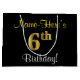 Den här enkla presentsäcksdesignen i eleganten innehåller ett personlig som "Namn-här's 6e Birthday!" (med "6e" som har ett faux/imitation guld-liknande färgutseende) på en svart färgad. Namn är i skriptliknande gult-färgad och kan anpassas. En sådan här personlig-födelsedagspressning skulle kanske kunna användas när en present eller gåva till någon som firar sin sjätte födelsedag är ge. [~Z0000258]