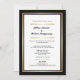 Elegant Black and White med Guld bröllopsinbjudan designad på en vit bakgrund med svart och guld gräns och svart text. I texten på framsidan finns: Namn, datum och tid för Bröllop, plats och Adress, mottagningsnoter och OSA. Baksidan är en svart bakgrund. Om du vill anpassa dig infogar du bara dina uppgifter i vår enkla mall och ersätter exempeltexten. Se till att du ser hela Eleganten Black and White med Guld Bröllop Collection för matchande kontorsmaterial.