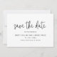 Modern svart och vit typografi Spara datumkortet med en enkel design med "spara datumet" i ett tunt handskriftsteckensnitt för elegant. Nedan följer fyra linjer text för er bröllop-information. Baksidan är en solid svart. En chic- och snyggt-design för att meddela datum för ditt kommande bröllop.