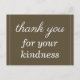 Denna eleganta och rena tack-vykortdesign har meddelandet " tack för din vänlighet " på framsidan, tillsammans med ett anpassningsbart meddelande på baksidan. Det kan användas för att tacka någon som har gjort något speciellt.