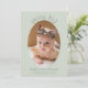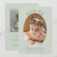 Ett enkelt och elegant födelsemeddelande och tack för ett kort med en oval ram med en text som säger "tack" överst. Grönt färg.