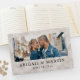 Elegant och romantisk bröllop-guestbook-personlig på framsidan och baksidan med förlovning foton av lycklig-paret. Framsidan och ryggraden skrivs ut med datum för namn och bröllop.