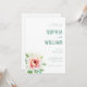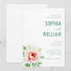 Denna eleganta bröllopsinbjudan har en minimalistisk layout med gott om negativt utrymme, vilket skapar ett rent och sofistikerat utseende. Designen visar upp en mjuk färgpalett med dämpade teal- och persikotonaler, kompletterad med ömtåliga botaniska illustrationer, inklusive en stor ros och grön lövverk. Typografin kombinerar feta versaler för namnen med ett skriptliknande et-tecken, vilket förstärker den formella men ändå inbjudande atmosfären. Perfekt för par som söker en klassisk och modern estetik, sätter denna inbjudan tonen för en intim och lugn firande.