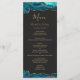 Den här eleganten har den moderna bröllop-menyn överst och grund gräns av tealblått vattenfärgat agat som trimmas med guld faux glitter. Texten visas i elegant guld-färgad handskrift, kursiv och mönsterruta typsnitt på en skiffersvart bakgrund. Den agate-designen upprepas på motsatt sida.