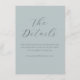 This wedding enclosure card features a minimalist design with a soft, muted teal background that creates a calming and elegant atmosphere. The layout is clean and balanced, showcasing the phrase "The Details" in an elegant cursive script at the top, followed by straightforward sans-serif text directing guests to visit a website for more information. The typography hierarchy ensures readability while maintaining a sophisticated look, perfect for formal occasions. With its modern yet classic aesthetic, this card conveys anticipation and organization, making it ideal for weddings or similar events where clarity and style are essential.