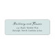 This elegant label features a minimalist design with a soft teal background and dark gray text, creating a sophisticated and calming aesthetic. The layout is centered, showcasing a cursive script for names paired with a formal serif font for addresses, offering both personalization and readability. Ideal for weddings or formal events, the clean lines and ample negative space emphasize clarity and refinement, making it perfect for invitations or personalized stationery.