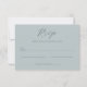 This wedding RSVP card features a minimalist and elegant design with a soft, muted teal background that creates a serene and sophisticated atmosphere. The layout is vertically oriented, with ample negative space enhancing the focus on the text elements. A combination of cursive script for "RSVP" and clean sans-serif fonts for the response options adds subtle visual interest while maintaining readability. Perfect for formal events, this card conveys an understated elegance, making it ideal for couples seeking a modern yet classic invitation style.