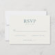 This elegant wedding RSVP card features a minimalist design with a clean white background and a muted teal color palette, creating a serene and sophisticated atmosphere. The layout is structured yet open, with bold serif typography for the "RSVP" heading and simple sans-serif fonts for guest responses, ensuring clarity and readability. Decorative elements include an ornate cursive initial and circular bullet points, adding subtle elegance to the modern composition. Perfect for formal weddings, this card balances functionality with aesthetic appeal, making it easy for guests to respond while maintaining a stylish presentation.
