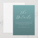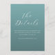 This wedding enclosure card features a minimalist and elegant design with a solid teal background that creates a calming and sophisticated atmosphere. The layout is vertically aligned, showcasing the phrase "The Details" in an ornate script font at the center, followed by clean sans-serif text guiding guests to visit a website for more information. The color palette of soft teal and white enhances readability and adds a touch of contemporary elegance. Perfect for formal occasions, this card combines modern typography with ample negative space, ensuring clarity and focus while conveying a mood of warmth and personalization.