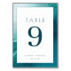 This elegant wedding table card features a minimalist design with a large, bold numeral "9" as its focal point. The layout is clean and modern, with ample white space and an abstract watercolor background in shades of blue-green that add depth without overwhelming the central elements. The typography is simple and sans-serif, enhancing readability and sophistication. Perfect for formal occasions, this card combines simplicity and refinement, making it both informative and visually appealing.