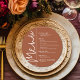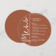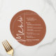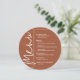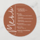 En rund meny för middagsbordet i terrakotta presenterar dina menyval i elegant vit text, perfekt för en modern bröllopsmottagning, middag före bröllopet, årsfest eller någon speciell tillställning med sittande middag. Anpassa enkelt med din middagsmeny och detaljer. FLER färger i vår butik.