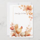 An elegant thank you card featuring a soft floral frame and a charming chicken illustration in warm spring tones.