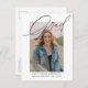 Trendig Calligraphy Three Photo Budget Studentfest Invation vycard innehåller ett foto på framsidan och två foton på baksidan tillsammans med studenten inbjudningsinformation.