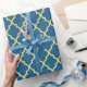 Elegant, trendig, klassisk marinblått och gult quatrefoil dekorativt mönster. För helgdag, jul, födelsedag, tillfälle, firande.