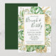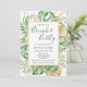 Den här eleganten tropiska inbjudningskort för möhippan är perfekt för möhippa champagne brunch. Den har grönt och guld handflatan, filodendron och fern löv bakom en elegant guld ram. Den mörk grönt texten är helt och hållet anpassade. Guld stänk accentuerar denna exotiska botaniska design och ger inbjudan till lite sofistikerat stollig. Denna öoas inbjudan är perfekt för all möhippa brunch utomhus, strand eller tropiskt temat.