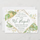 Den här elegantens tropiska inbjudan till bröllopsmottagning innehåller exotisk lövning med accenter från guld. En modern geometrisk guld ram markerar den mörk grönt texten. Guld stänk accentuerar den botaniska utformningen och gör att stollig blir lite sofistikerat på inbjudan. "Vi Elope!" visas i mitten i inbjudan. Detta är perfektens bröllop meddelande och inbjudan att ta emot alla tropiska temat bröllop.
