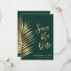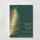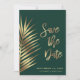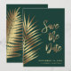 Elegant spara datum meddelande-kort med tropisk handflatan och fern löv i guld mot en mörk grönt bakgrund, "Spara datum" i ett stort snyggt-skript och namn och spara datuminformationen i minimal modern typografi. Perfekt till ett destinationsbröllop.