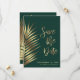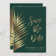 Elegant spara datum meddelande-kort med tropisk handflatan och fern löv i guld mot en mörk grönt bakgrund, "Spara datum" i ett stort snyggt-skript och namn och spara datuminformationen i minimal modern typografi. Perfekt till ett destinationsbröllop.
