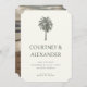 Elegant Tropical Vintage Handflatan Photo Bröllop spara datum bjudande med en illustration och anpassningsbar på baksidan av handflatan-träden - en fullkomligt Träd textmall som passar din anpassade som ett tropiskt firande, destinationsbröllop, Mexiko bröllop eller Hawaii bröllop.