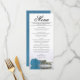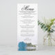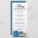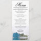 Den här vackra menyn kommer att lägga lite stil till ditt bröllopsmottagande. Den har en vacker och romantisk utformning med en enda himlar-blå, turkos eller azure-färgad ro som ljuger på sidan och reflekterar i ett bassäng av vatten med vinkara och kramper. Det finns utrymme för namn från paret och bröllop, och texten är helt anpassade.