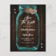 Turkos rustikalt bröllop spara datum vykort med en murkelburk och säckvävshjärtan mot en lada trä bakgrund prydd med gnistrande ljus. Anpassa enkelt detta söta spara datum vykort online. Matchande artiklar finns tillgängliga för att komplettera detta turkosa bröllop spara datum.