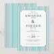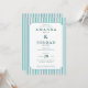 Denna eleganta bröllopsinbjudan har en klassisk design med vertikala ljusblå och vita ränder som ramar in en central vit panel. Färgpaletten inkluderar mjuka teal-ackordenter som skapar en modern men ändå tidlös look. Layouten är ren och sofistikerad och använder serif-teckensnitt för en formell känsla, medan anpassningsbara textfält möjliggör anpassning av namn, datum och platser. Perfekt för en traditionell fest, stämningen är förfinad och inbjudande, idealisk för par som söker en blandning av vintage-karaktär och samtida stil.
