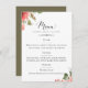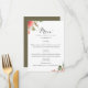 Elegant typografi, bohemisk korall akvarell blommor och löv, bröllopsmenykort med handritad skrift och dekorativa accenter. Bakgrundsfärg som visas i rustik oliv kan anpassas.