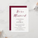 Denna fantastiska efterbröllopsinbjudan har marsala / burgunderfärgad kalligrafi tillsammans med modern svart text på en elegant vit bakgrund.