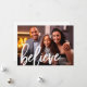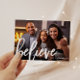 Inspirerande julhälsning med tro med vit borstsrift och ett fullständigt foto med enkel vit bakgrund, vilket ger utrymme att skriva en personlig hälsning eller lämna tomt!