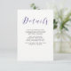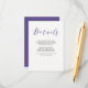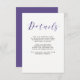 Detta fantastiska vykort med gästdetaljer har violett-lila färgade kalligrafi tillsammans med modern svart text, på en elegant vit bakgrund. Perfekt för ett formellt, traditionellt bröllop med en modern twist! Du kan använda dessa kort för att inkludera information om din bröllopsmottagning, köranvisningar, boende och allt annat du vill att dina gäster ska veta.