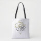 The tote bag features a minimalist, yet stylish design with bold, black and gold text on a classic pinstripe patterned white background. The silvery gray vertical stripes providing a modern and trendy look, making it a stylish and popular gift for the bride-to-be. The text "Future Mrs." uses and elegant. bold and pretty calligraphy script. You can personalize this tote bag with the bride's first name "Jessica", future surname or last name, "Andersons", and the wedding date or establishment year "Est. 2026"