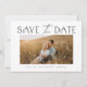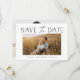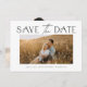 En Elegant Typography Photo Bröllop spara datum med modern skripttyp och enkel layout på framsidan. Baksidan har ytterligare ett foto och detaljer. Klicka på knappen Redigera om du vill anpassa designen.
