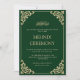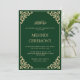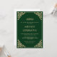 Detta är en elegant, ren smaragdgrön islamisk muslimsk bröllopsinbjudan för det lyckliga parets henna Mehndi-ceremoni. Det finns ett formellt guldbokstavs typsnitt med en antikt barock bladdekoration i hörnet. Vintage. Delikat. Romantiskt. Du kan anpassa denna utskrivbara mall med hjälp av Designverktyget på höger sida. Du kan redigera parets namn, typsnittsstil och storlek också. Texten är skriven med versaler. Fira din speciella dag genom att skicka ut denna inbjudan eller dela som direktnedladdning. Tidlös elegant bröllopsbrevpapper. Vitt kuvert ingår.