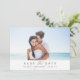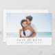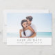 Med vårt enkla, rena och chic foto sparar du datumkorten för vänner och familj i inbjudan till sparan av din dejt. Med platta kort kan du skapa ett förlovning för att orientera vågrät med ett vitt band i grund och visa "spara datumet" och datum för namn och bröllop i en chic som innehåller en blandning av moderna block- och kalligrafteckensnitt. Lägg till ytterligare information på baksidan, inklusive fullt, plats för bröllop, webbplats och en indikation på att en formell inbjudan kommer att följa.